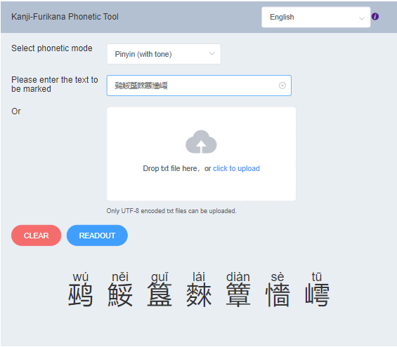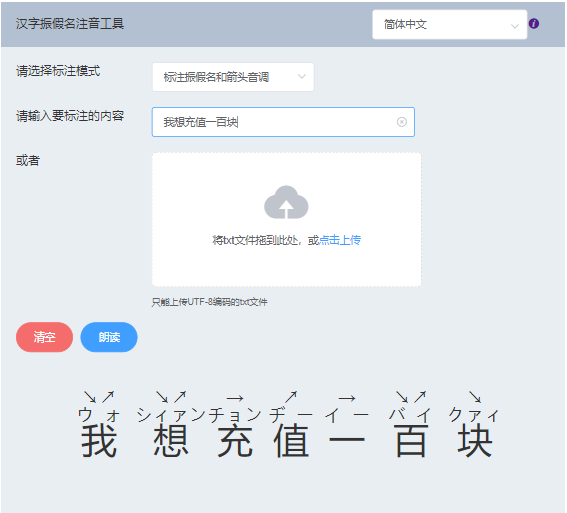 + 为输入或上传的文本中的汉字注音,可以标注假名或者拼音,并可选择是否标注声调。